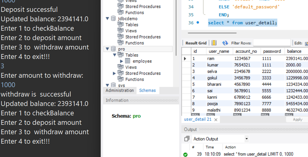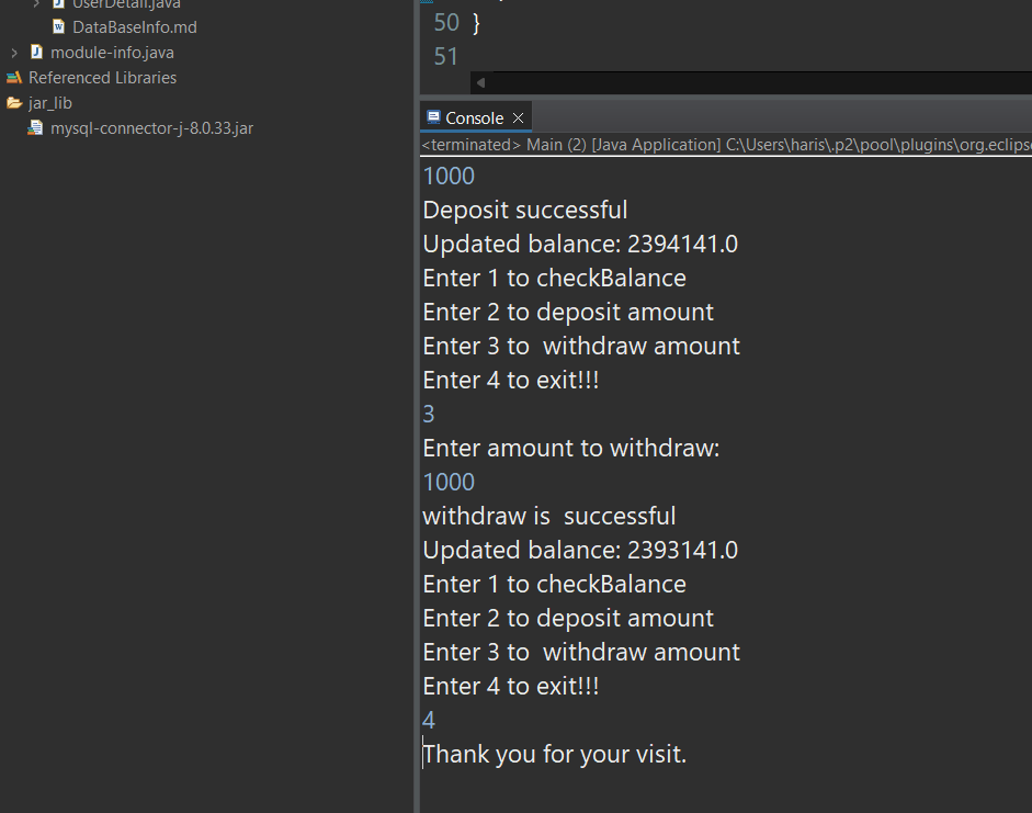 - The deposit method prompts the user to enter an amount to deposit, updates the balance in the database, and displays the updated balance.